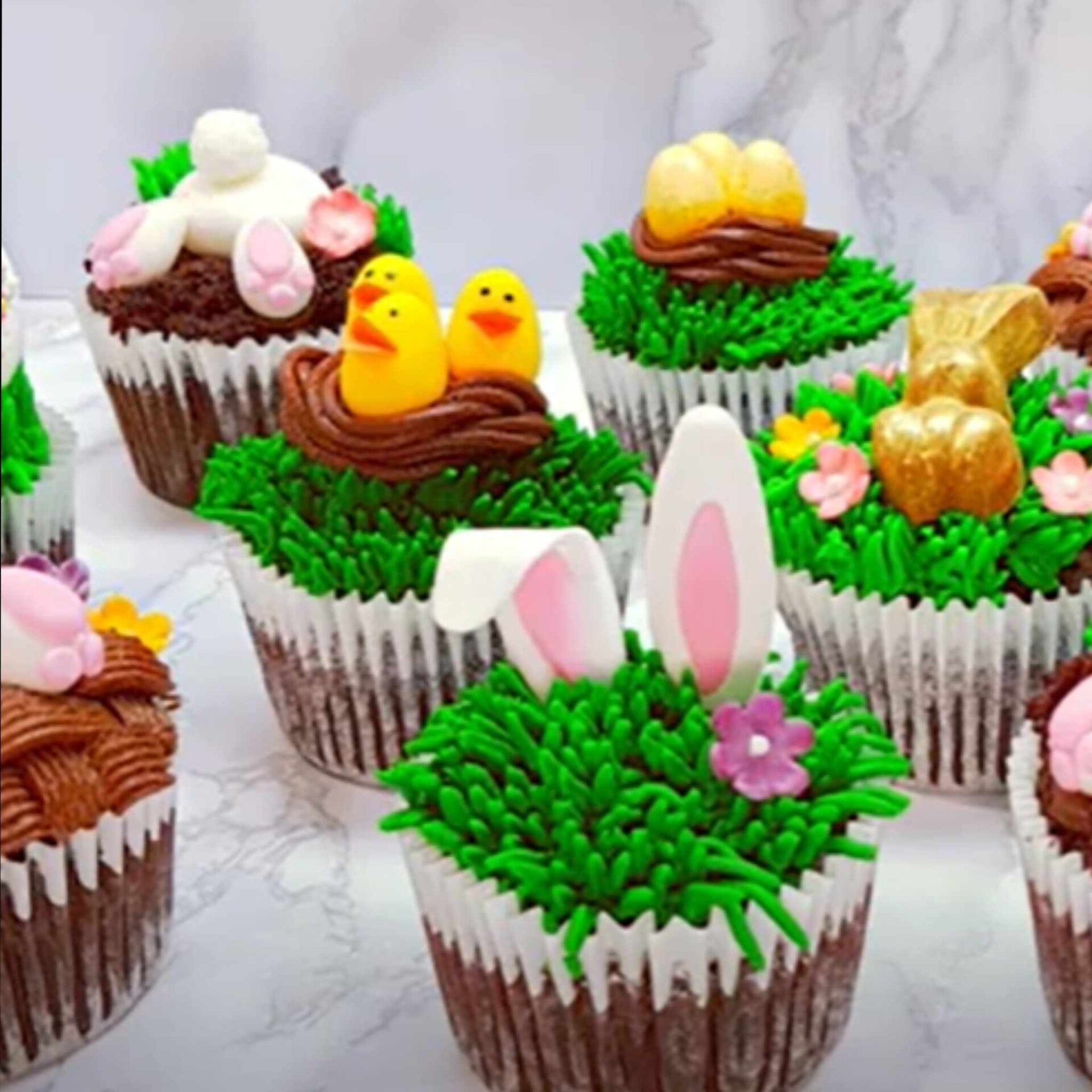 We decoreren 6 cupcakes in een Lente- / Paasthema.