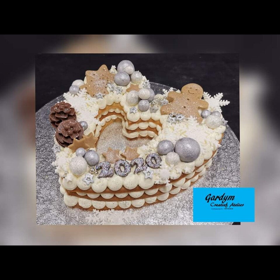We decoreren de taart in een eindejaarsthema in goud en of zilver.