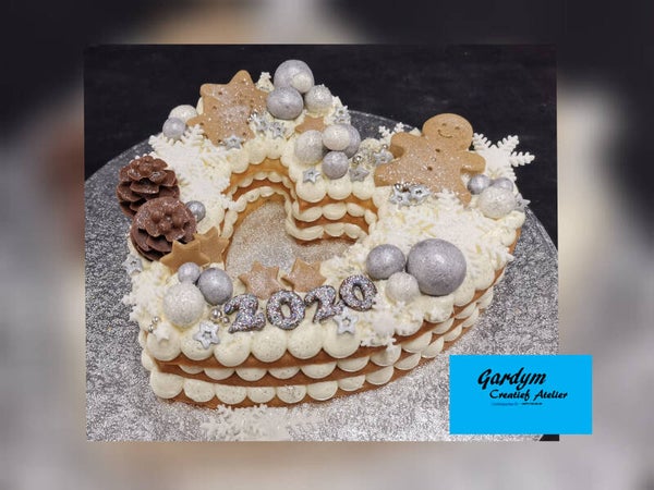 We werken met 3 lagen koek (open hartvorm, gesloten hart of cirkelvorm). We spuiten deze op tussen de verschillende lagen. We decoreren de taart in een feestelijk thema. We voorzien enkele macarons of pralines voor elke taart. Je kiest je eigen kleurschema !!!